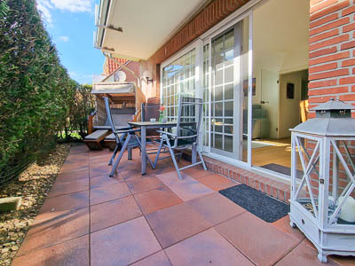 Die gut ausgestattete Einbauküche ist in den Wohn- und Essbereich integriert. Von hieraus haben Sie direkten Zugang zur kleinen Terrasse. Im Strandkorb können Sie die Füße hochlegen und die Seele baumeln lassen.