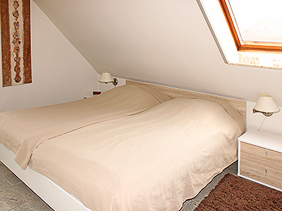 Das Wohnzimmer ist gemütlich eingerichtet; auffallend ist hier vor allem die interessante Fensterkonstruktion. Auf dem angrenzenden Balkon können Sie einen angenehmen Urlaubstag entspannt ausklingen lassen. Die separate Küche ist mit Geschirrspüler ausgestattet und verfügt über einen hellen Essplatz. Im Elternschlafzimmer befindet sich ein Doppelbett und im Kinderschlafzimmer zwei einzelne Betten.